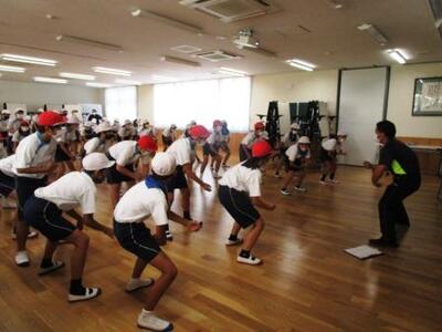 体育館では1年生がラジオ体操の練習。伸ばしたり曲げたりするポイントを一つ一つ覚えていました。運動会ではカッコイイ準備運動をみせてね