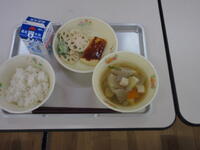 牛乳、コーンわかめごはん、のっぺい汁、さばの香味漬け、キャベツの甘酢あえ、(ジューシー)でした。今日から運動会練習にあわせてジューシーが始まりました。1年生は、予行練習が終わった後に美味しそうに飲んでいました。