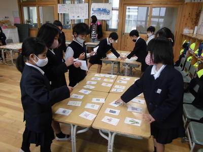 谷口先生とジョーンズ先生の英語の授業。英語でのあいさつ・ウォーミングアップに続き、グループ対抗キャラクター当てクイズ!グループで力を合わせて得点を重ねていました。終わった後には「楽しかった-」の声が挙がりました。