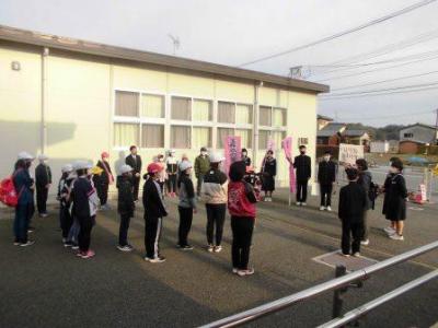 今朝は今年初めてのあいさつ運動に、栗崎・大坊地区の皆さんと運営委員・生活委員の当番が参加してくれました。松川会長さんからは「徒歩で来る皆さんが、朝から元気なあいさつをしてくれると学校全体が元気づきます。これからも頼みます。」と激励を受け、大倉さんのかけ声で「がんばるぞ!」と締めて終了しました。寒い中、みんな、ありがとうございました