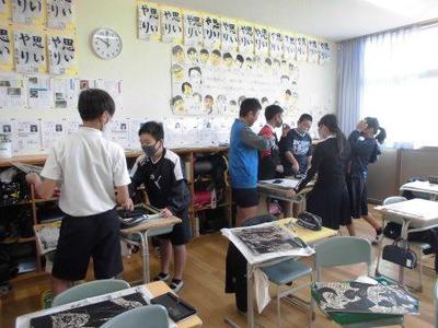 6年生は協力して版画の刷り