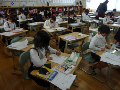 【しっかりと基礎学力を・・・1年生】学年末になり、どこの学級でもまとめの学習が行われています。1年生のクラスでも、テストのやり直しや苦手な問題を解くなど、子どもたちは黙々と頑張っていました。