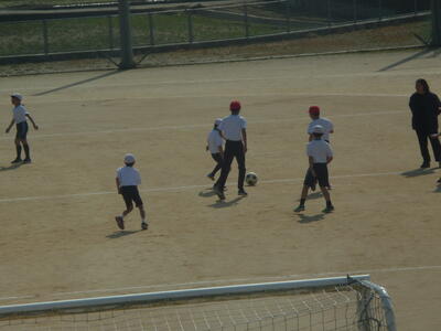 【この季節はサッカー・・・5年1組、1年生】5年生も、1年生も体育ではサッカーをしています。5年生は、5人対5人のゲームで盛り上がりました。1年生は、カラーコーンを目がけてボールを蹴り、チームごとの合計点数を競っていました。