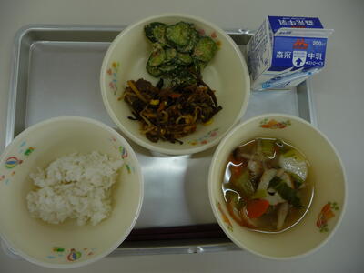 ※今日の給食メニュー・・・麦ごはん、ぶたじる、ひじきコロッケ、ちぐさ和え、牛乳