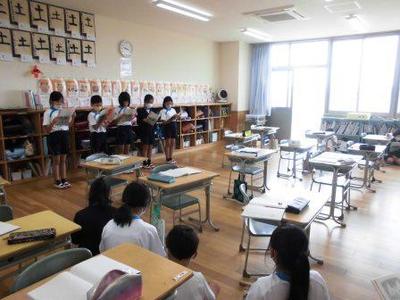3年生教室で国語「ちいちゃんのかげおくり」の音読会が行われていました。この時期、国語の教科書には1年生「くじらぐも」2年生「お手紙」4年生「ごんぎつね」5年生「たずね人」6年生「やまなし」と、名作文学が配列されています。ご家庭でもお子さんの音読を聴いていただくことで親しんでおられるのではないでしょうか。その子なりの解釈が音読の声に表れる文学教材、秋の夜長にぜひじっくり耳を傾けてくださいね