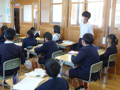 【楽しくすごすために・・・6年生 国語】国語の時間に、自分たちで議題を決めて話し合いをしていました。議題は「1年生との遊びを考えよう」で、活発に意見を交わしていました。