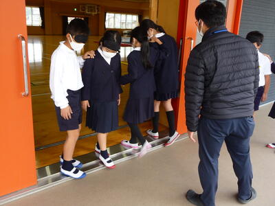 【小中合同火災避難訓練】今日の6時間目に小学校中学校合同の火災避難訓練がありました。中学校理科室を出火場所と想定し、全校児童生徒と全職員が運動場に避難しました。避難した後、代表児童生徒による消火器訓練や消防署の方からの話がありました。