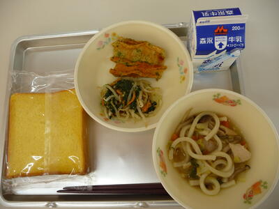 ※今日の給食メニュー・・・米粉入り人参パン、鶏すきうどん汁、ちくわの磯辺揚げ、ほうれん草のごま和え、牛乳