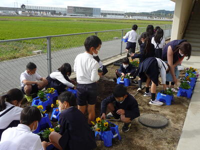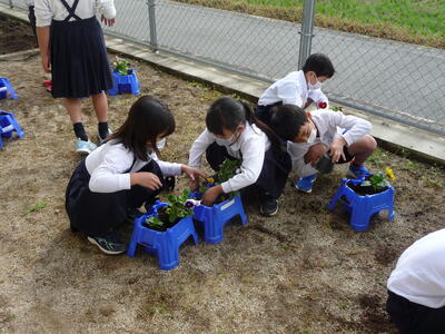 【花の苗を植えました・・・委員会活動】委員会の時間に、学校運営協議会の松川会長さんに手伝ってもらいがら環境ボランティア委員会で、花の苗(パンジー、ビオラ、ノースポール、アリッサム)を植えました。花が好きな子どもたちで、楽しそうに丁寧に植えていました。