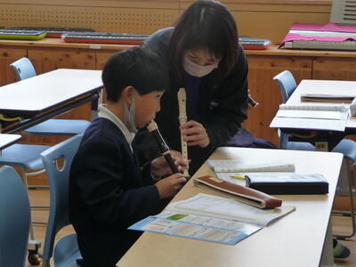 【綺麗な音色を・・・音楽 4年1組】音楽の時間にリコーダーを吹く練習をしました。主に、ミ・ファ・ソの音を吹きました。担任の先生が丁寧に個別指導をされていました。
