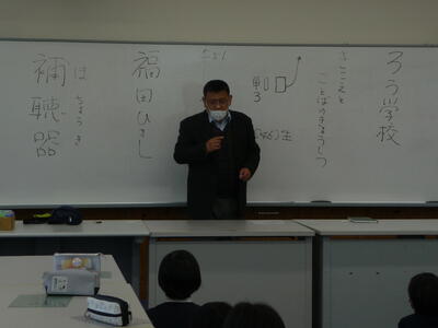 【福田さんの話を聞こう・・・総合的な学習の時間 4年1組・2組】耳の不自由な福田さんに来校していただき、お話を聞かせていただきました。「たまご・たばこ・なまこ」の言葉はとても聞きづらいことなどの具体的な話や補聴器のことについて話していただきました。また、手話の体験もさせていただきました。
