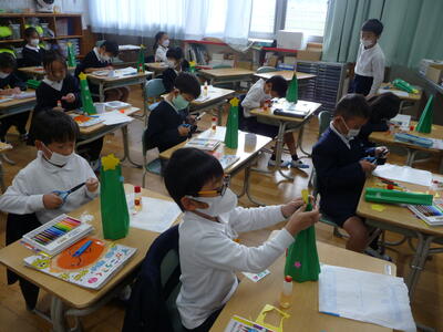 【自然の様子を絵に描こう(昆虫と遊んでいる絵) 1年1組・2組 図工】一人一人が思い思いに自分の好きな昆虫を描いていました。(作品はまだ途中の段階です)