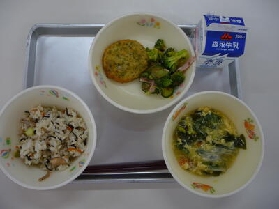 ※今日の給食メニュー・・・ひじきごはん、かきたま汁、大豆と豆腐のフライ、ブロッコリーのおかかサラダ、牛乳
