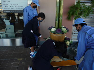 【くまもと県北病院に門松をプレゼント】今日の夕方、北稜高校造園科の生徒さんや玉陵中生徒、本校の代表児童4名で、くまもと県北病院へ「門松」をプレゼントしました。これは北稜高校の企画で行ったもので、造園科の生徒さんが作成された「門松」に、本校児童が最後の仕上げ(葉ボタンを植えたり、松竹梅の飾りをしたり等)をしてプレゼントしたものです。子供たちにとっても、たいへん貴重な体験となりました。できあがった門松はとても立派で、病院を訪れた方や職員の方の目を引くことと思います。