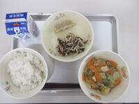 給食のメニューは、麦ごはん、牛乳、ホキの磯の香天ぷら、わかめの酢の物でした。給食に出ていたわかめですが、海の中では茶色っぽい色をしていますが、熱を加えて温めたときに緑色になるそうです。