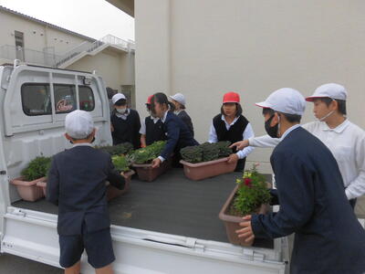 玉陵中学校主催のスクールボランティアに環境・ボランティア委員会の子どもたち数人が、花植えに参加しました。中学生や学校協働推進委員の荒木さんらの手ほどきを受け、花植えができました。この花は、7月に新玉名駅や県北病院へ飾るためのものです。今から、しっかり根付かせ、その花を飾って、地域の皆様を元気にする地域貢献を行う予定です。