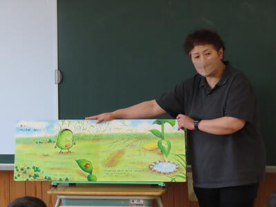 2年2組の教室をのぞいたところ、セス先生が絵本をもって読み聞かせをされていました。
