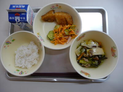 ※ 麦ごはん、マーボーあつあげ、にんじんシューマイ、中華あえ、牛乳 (マーボーあつあげは、具沢山で甘めの味付けでおいしかったです。)