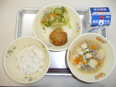 ※今日の給食メニュー・・・ツナごはん、とうふ汁、大豆と豆腐のフライ、ささみのサッパリサラダ、牛乳