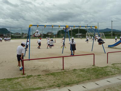 【雨水がひいた運動場で遊ぶ子どもたち】朝は田んぼのようになっていた運動場も、昼休みにはすっかり乾いていました。そこへ子どもたちも元気よく飛び出して行き、楽しそうに遊んでいました。運動場の水はけの良さは最高です。