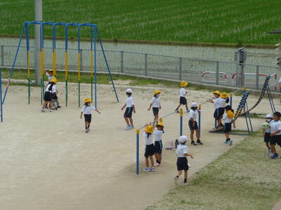 【昼休みに外で元気に遊ぶ児童】・・・今日は久しぶりに曇りで、暑さ指数が少し落ち着いていたため、「水分補給をして、帽子をかぶって、マスクを外して、外で遊んでもいい」と放送をしたところ、水を得た魚のように元気いっぱい遊んでいました。