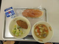 今日の給食メニューは、麦ごはん、牛乳、大根と油あげのみそ汁、ささみレモン漬け、大豆の磯煮でした。みそ汁に大根が使われていました。寒い時期の大根は甘みがあるということで、みそ汁にとてもあっていて、美味しかったです。