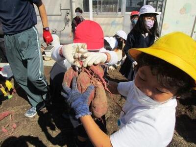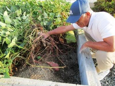 スマイル農園のおいも、松川会長さんとこっそり点検してみました。大きなおいもが見えました