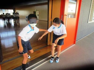アイマスクをつけて視覚障がい体験。