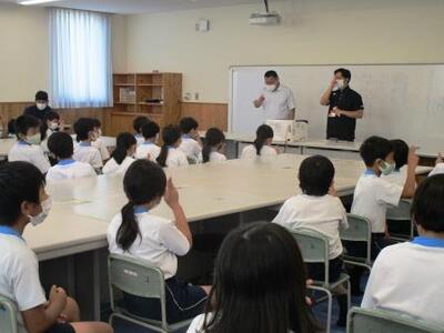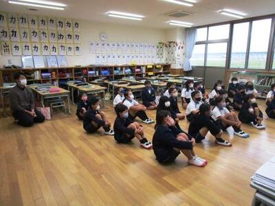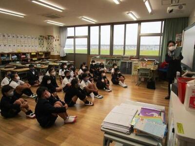 交通安全担当の子本先生から、天草での痛ましい小1男児の交通死亡事故を踏まえ、全体指導をしていただきました。
