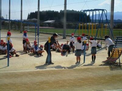 2年生は外で鉄棒。逆上がりガンバレ!