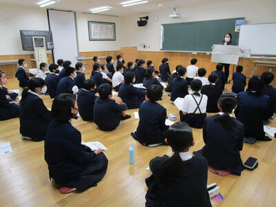 6年生は修学旅行前の事前学習。真剣に話を聴いています。いよいよ今週木・金に迫ってきました。