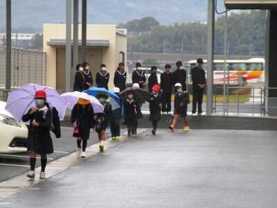 バス登校児童も元気な挨拶が増えてきました。一列歩行も上手に!