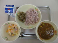 給食のメニューは、牛乳、雑穀ごはん、畑の肉カレー、いりこの酢炊き、ヨーグルトあえでした。