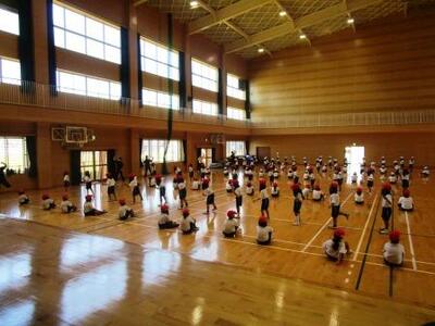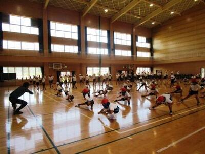 体育館ではラジオ体操の練習。のびたり曲げたり、様になってきました。