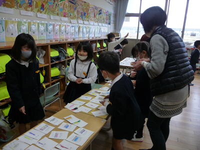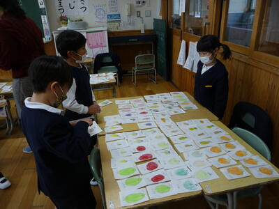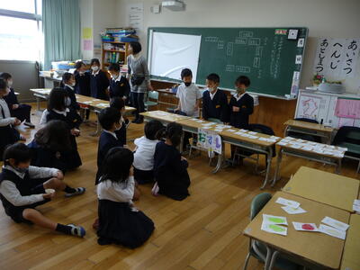 【おみせやさんごっこをしよう・・・1年2組】1年2組の教室には、お寿司屋さんやパン屋さん、洋服屋さんや文房具やさんなど7つのお店ができ、にぎやかにお店屋さんごっこが開かれました。手作りの硬貨で、自分の買いたい物(カード)を買うのですが、売る側も買う側もとても楽しそうでした。お釣りを計算したり、売り上げを合計したりと、「楽しく学ぶ」活動でした。