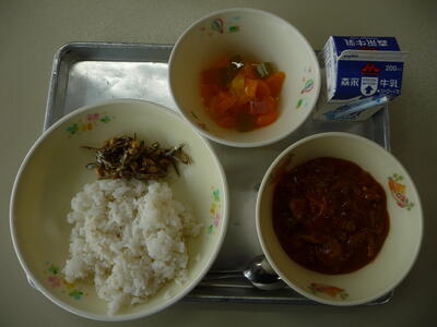 ※今日の給食メニュー・・・麦ごはん、ハヤシシチュー、いりこと大豆のりんかけ、フルーツミックス、牛乳