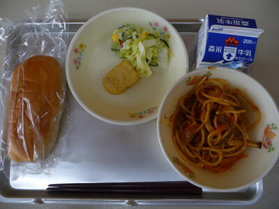 ※今日の給食メニュー・・・ミルクパン、スパゲティナポリタン、チキンナゲット、フレンチサラダ、牛乳