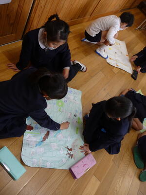 【すごろくで楽しもう・・・2年2組 図工】図工の時間に、グループに分かれて作った「すごろく」で楽しみました。すごろくのテーマは、グループで話し合って決めているということで、「海」や「森」など、わくわくするものばかりでした。