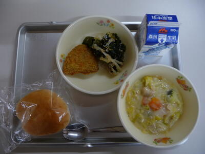 ※今日の給食メニュー・・・米粉パン、白菜の豆乳クリーム煮、かぼちゃフライ、じゃこサラダ、牛乳