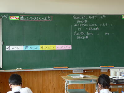 【数のしくみを調べよう・・・2年2組 】算数の時間に、4桁の数がどのような構成になっているのか、位取り表を使って学習しました。「4309」という数は、千の位は1000が4つ、百の位は100が3つ・・・。といったものです。