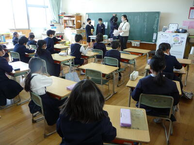 【読み聞かせ】朝の時間に、1月の読み聞かせがありました。どの教室をのぞいても、子どもたちは、読み聞かせをされる方を食い入るように見て、しっかりと聴いていました。