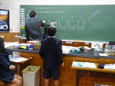 【温まると色が変わる・・・4年1組 理科】水の温まり方について実験をしました。ビーカーに入れた水が、どこからどのように温まっていくのか、子どもたちは食い入るように観察していました。
