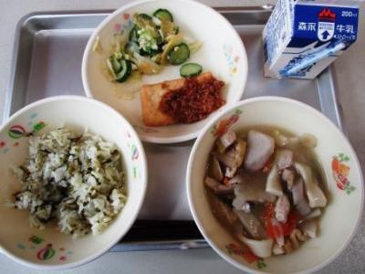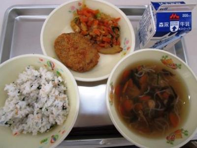 今日の給食は「まめ・ごま・わかめ・やさい・さかな・しいたけ・いも」全てが入った身体においしいメニューでした。おいしくいただきました