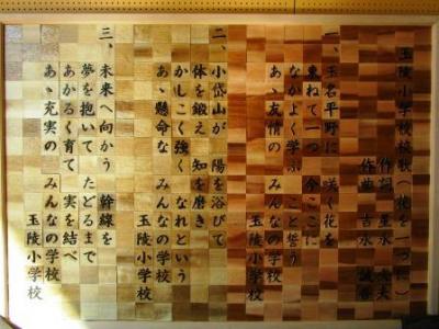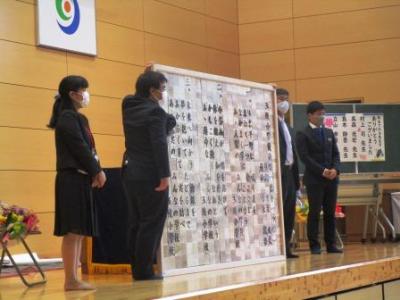 3年がかりで完成した木彫りの校歌。体育館前方に設置して末永く大切にします。