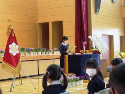 転出児童のあいさつ。本年度末、2名が転出します。寂しいですが、玉陵小の思い出を力に頑張ってね。(詳しくは29日配付の学校便りにて)