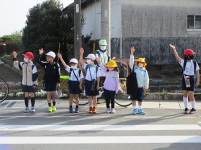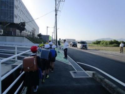 今朝もとても良い天気。元気に月曜日のスタートです。横断歩道を渡る登校班は、「班長さんの合図で『はい!』という元気な返事」「手をまっすぐ挙げる」…全部の班が1回で合格定着してきました。
