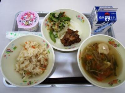 今日の給食は、4月のお誕生日お祝いメニューで「牛乳・麦ご飯・春野菜カレー・かみかみ大豆・オレンジポンチ」でした。玉陵小の4月生まれは26人おめでとうございます