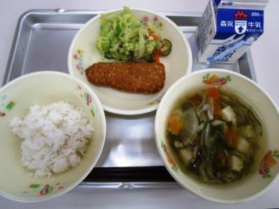 今日は「ふるさと熊さんデー」メニュー。水俣芦北地方の味で「麦ご飯・牛乳・青さ汁・太刀魚ごまフライ・サラ玉和え」の献立でした。とってもおいしくいただきました。ごちそうさまです