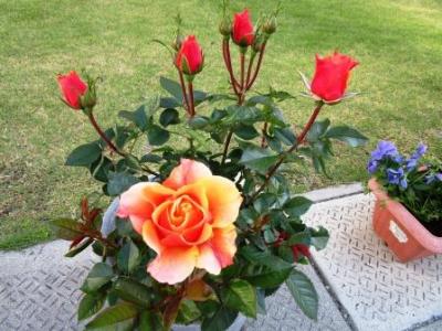 学校運営協議会の皆様がずっと大切にお世話くださっている薔薇の鉢に今年も鮮やかな花が咲き始めました。冬の間、地域学校協働活動推進員の大倉様のお宅で養生し、玄関前の芝生のところ、ちょうど中学1年生の教室前で立派な姿を見せてくれています。