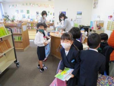 2組さんは図書の時間。お気に入りの本を見つけて借りていました